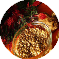 Накройте стол яркой скатертью (красный цвет всегда был символом торжества и кровного родства)! Разложите по всему столу свежие фрукты, веточки сосны (ведь, прежде всего, рождественская елка – символ вечной жизни и молодости)!Поставьте свечи в красивых подсвечниках, вазы (горшки) с живыми цветами, маленькое гнездышко из соломы с младенцем Иисусом.
