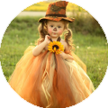 Да, да! Правда, даже маленькое пугало может быть невероятно очаровательным? То же фатиновое платье персикового цвета, ассиметричная шляпа, сшитая с черных и оранжевых фетровых лоскутков, подсолнух вместо пояса и нарисованный носик-заплатка.