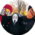 А людям для предстоящего общения с духами предлагаются такие маски. Они тоже совсем не страшные. Во всяком случае, я не испугался, встретив веселые компании, уже полностью подготовленные к торжественной встрече.