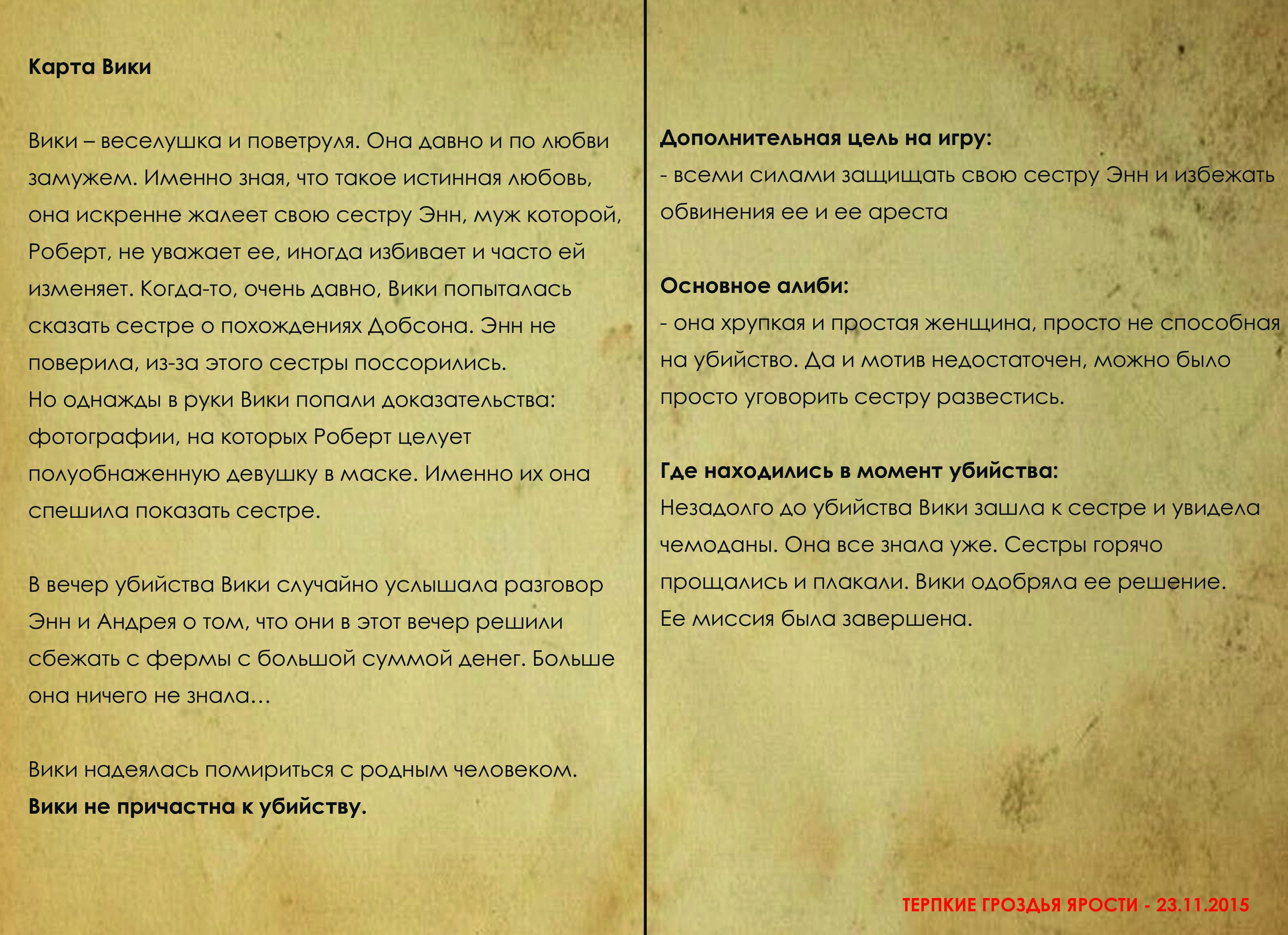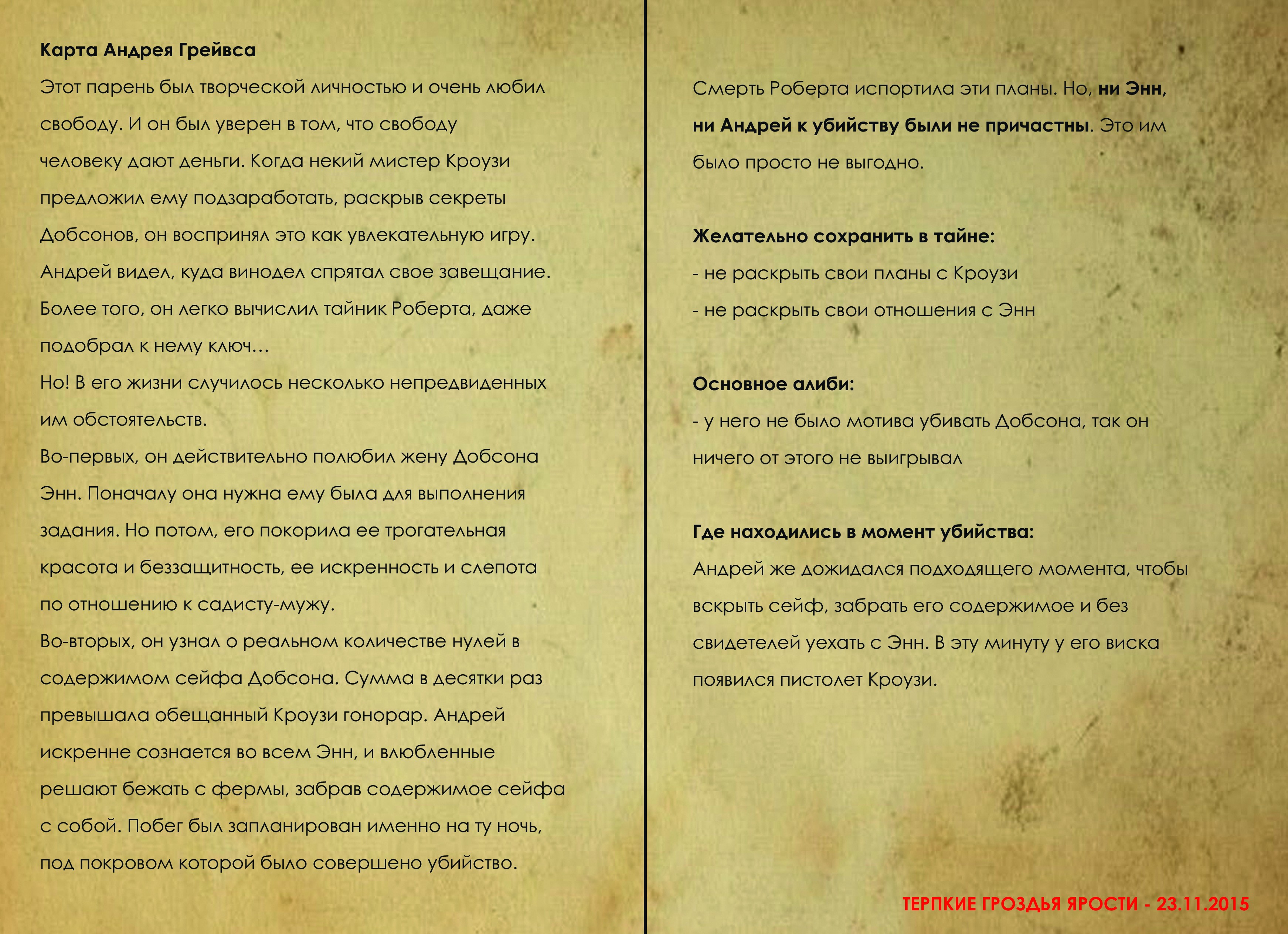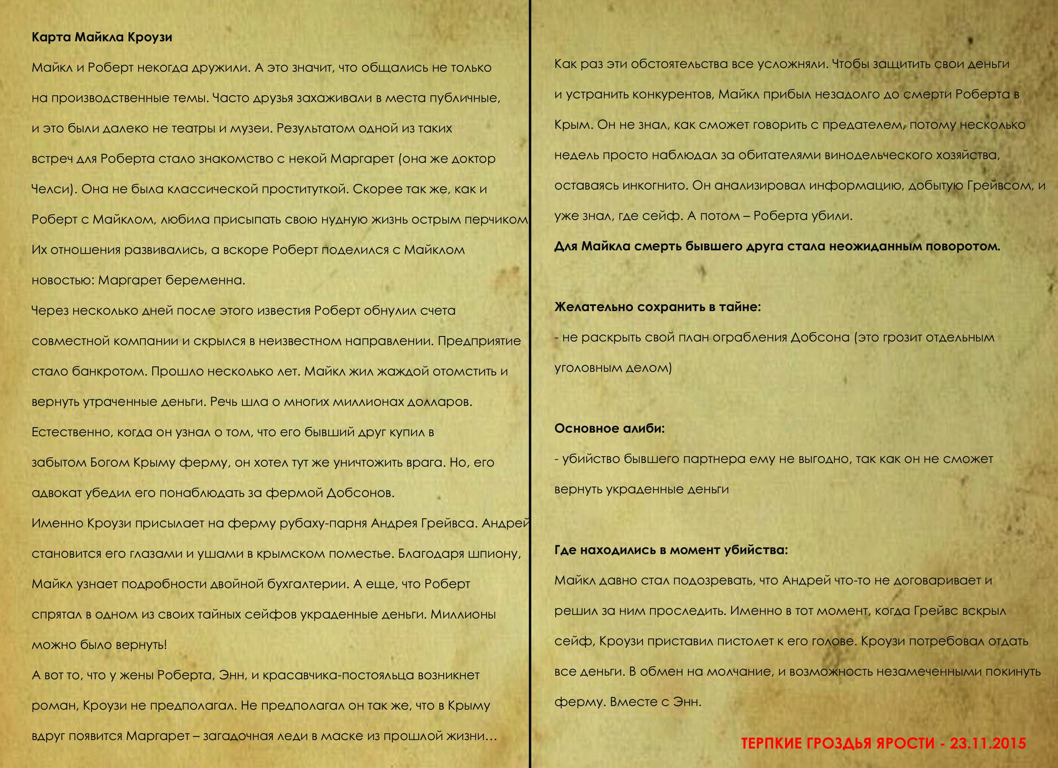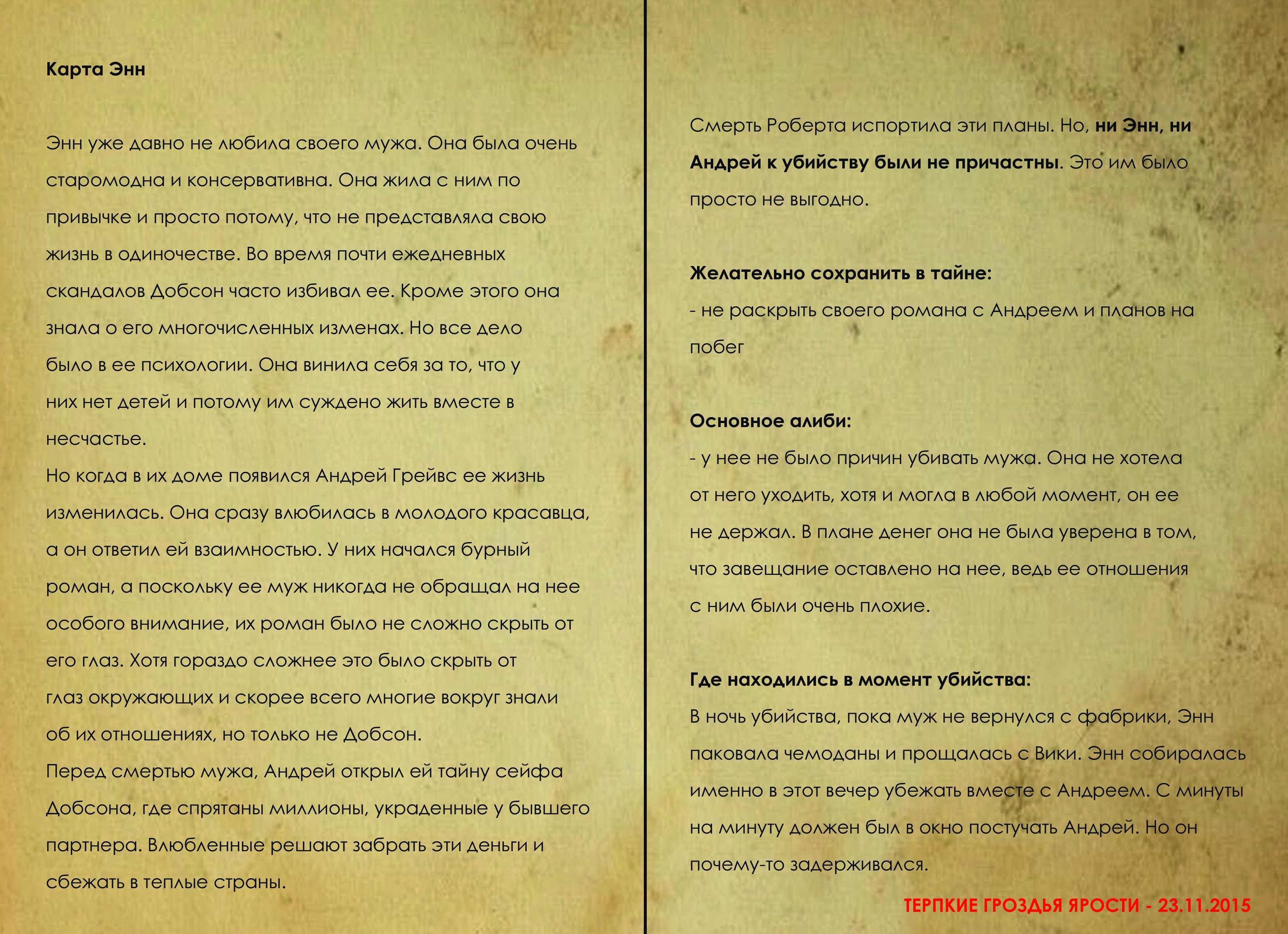 3. Распечатка основных текстов и подсказок для ведущего. По этой распечатке можно читать анонс и вступление в начале игры, зачитать о сюжете и основных действующих лицах.