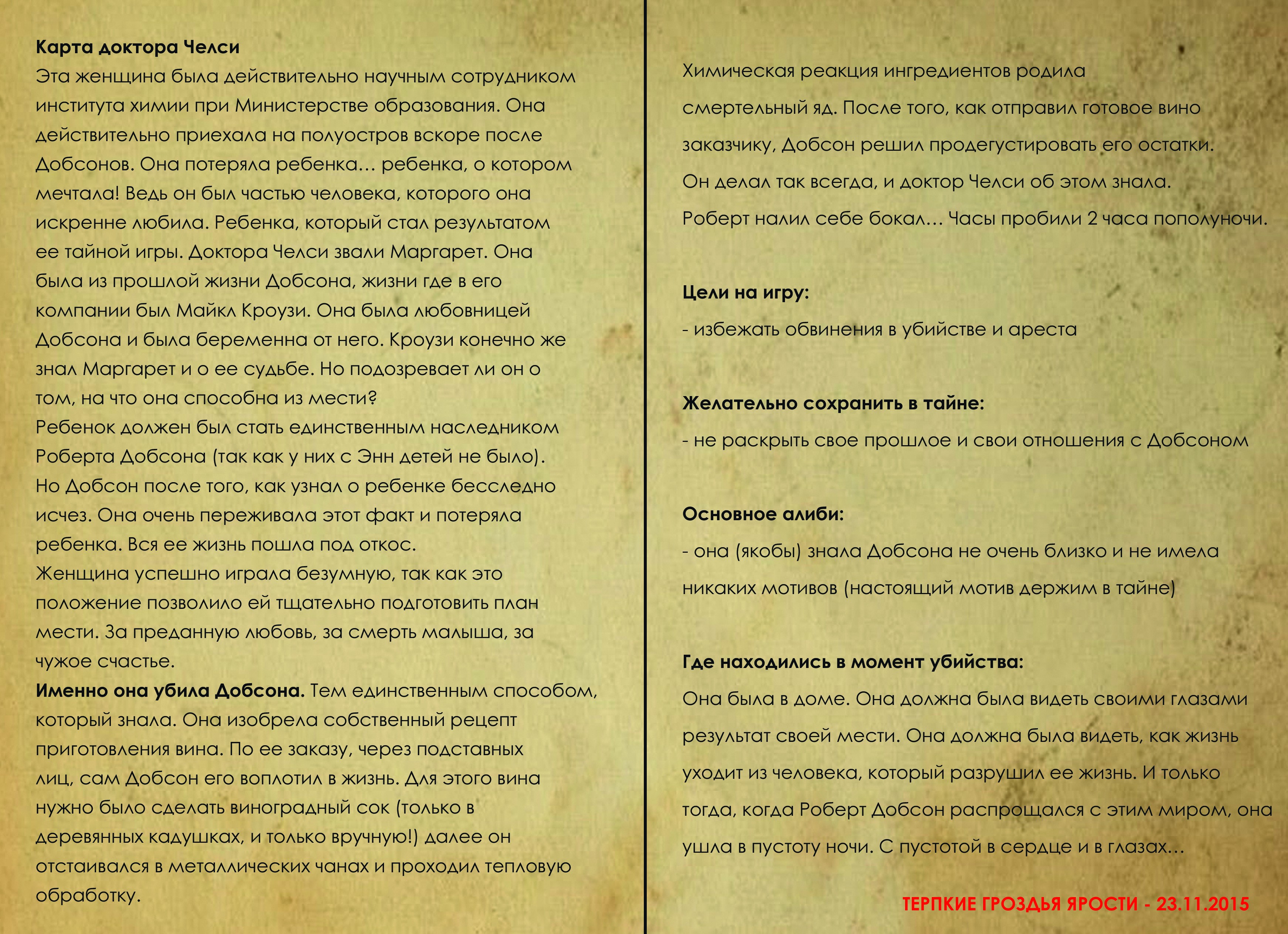 На роль доктора Челси и Екатерины нужно тоже выбрать достойных в плане актерской игры участников. Но будьте внимательны, не назначайте преступником самого сильного игрока, если все знают его как сильного, поскольку именно этот факт может послужить основной подсказкой следователю.