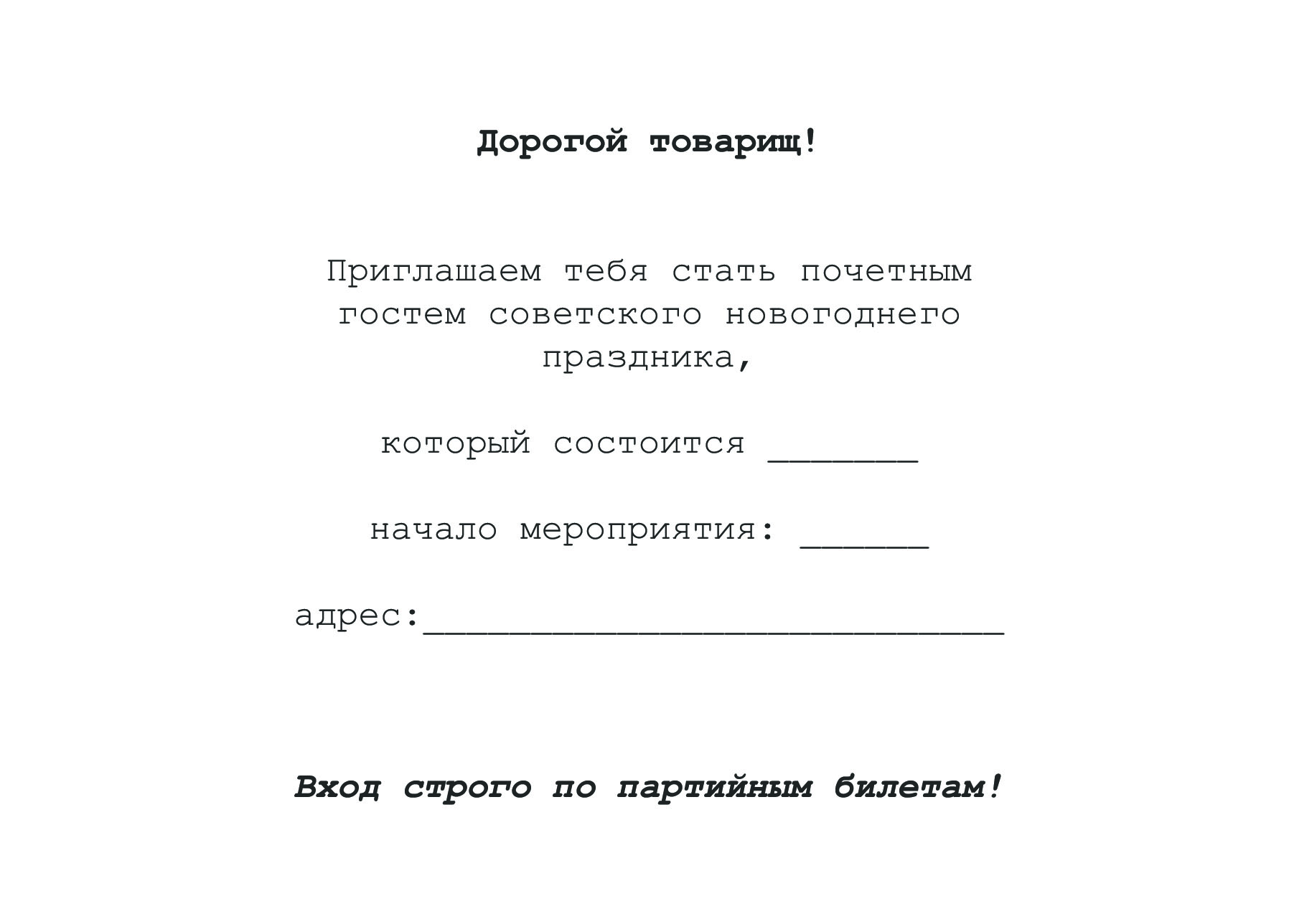 «Дорогой товарищ! Приглашаем тебя стать почетным гостем советского новогоднего праздника, который состоится _____! Начало мероприятия: ______, адрес:___. Вход строго по партийным билетам!»