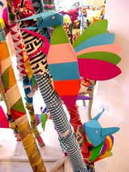 Основа «елки» металлический каркас конусовидной формы. «Гирлянды» от вершины до основания сделаны из обрезков ткани, скрученных в канат. А «птицы», «бабочки» и «зверушки» - оригинальное, яркое папье-маше. Кстати, к изготовлению последних можно привлечь подрастающее поколение! Дети, обычно, со всей серьезностью и интересом относятся к подобным заданиям.